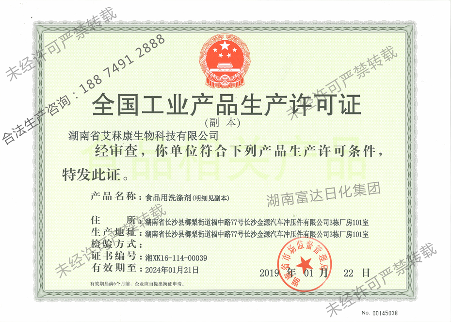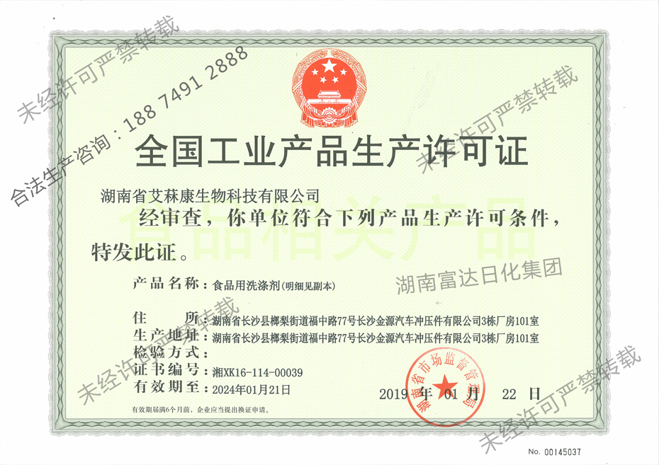 多項(xiàng)專利發(fā)明人王先軍 手機(jī):150-7483-5702 手機(jī):195-7316-0288湖南富達(dá)日化順利通過湖南省市場監(jiān)督管理局的各項(xiàng)審核,成功取得了《全國工業(yè)產(chǎn)品生產(chǎn)許可證》,獲得食品用洗滌劑(手洗餐具洗滌劑)生產(chǎn)資格,符合產(chǎn)品生產(chǎn)許可條件。