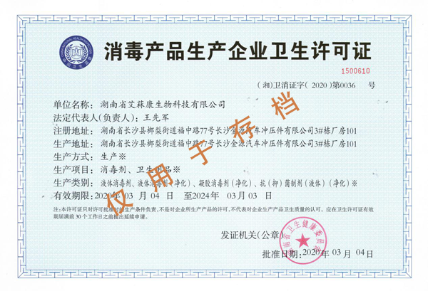 3月4日下午,湖南艾菻康生物科技有限公司順利拿到《消毒產(chǎn)品生產(chǎn)企業(yè)衛(wèi)生許可證》。