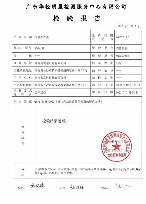 富達抑菌洗衣液檢測合格,抑菌率達到99.99%