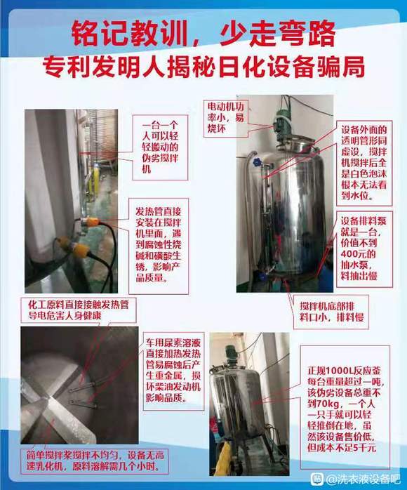 多項專利發(fā)明人王先軍 手機:150-7483-5702 手機:195-7316-0288洗潔精洗衣液車用尿素設備銷售者五花八門,許多不法商販炮制萬元投資可辦廠的謊言,推銷低價偽劣洗潔精設備,洗衣液設備,車用尿素設備,無數初創(chuàng)業(yè)者上當受騙血本無歸,為了讓創(chuàng)業(yè)者少走彎路,受良心驅使,公開揭示日化設備騙局,以此讓大家少走彎路。