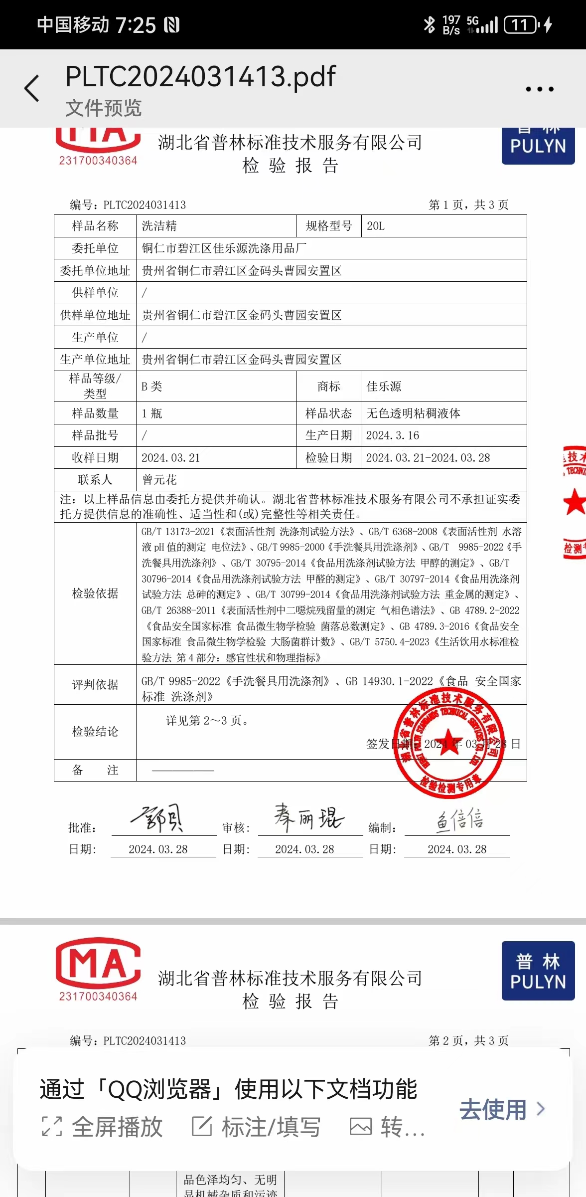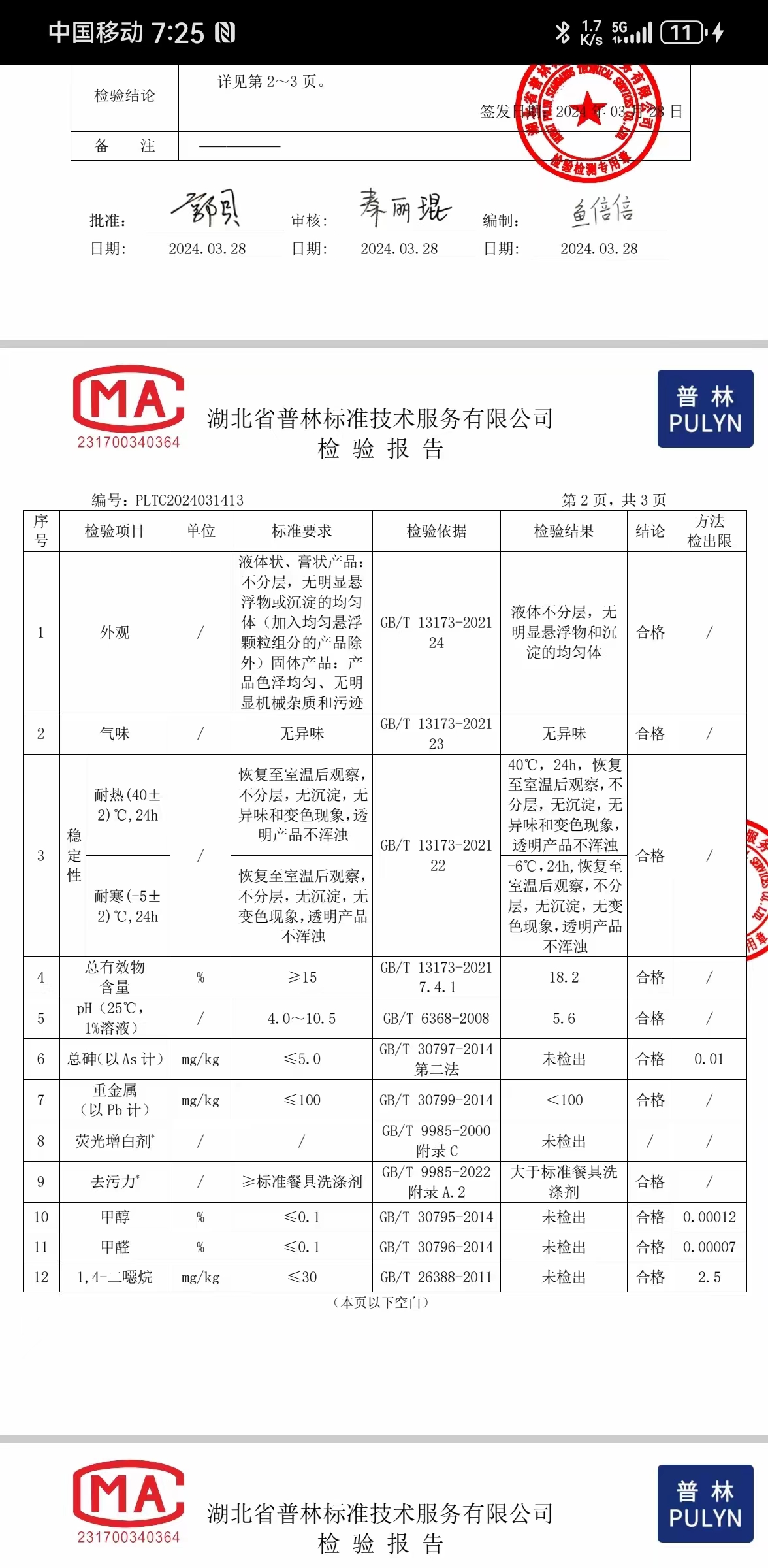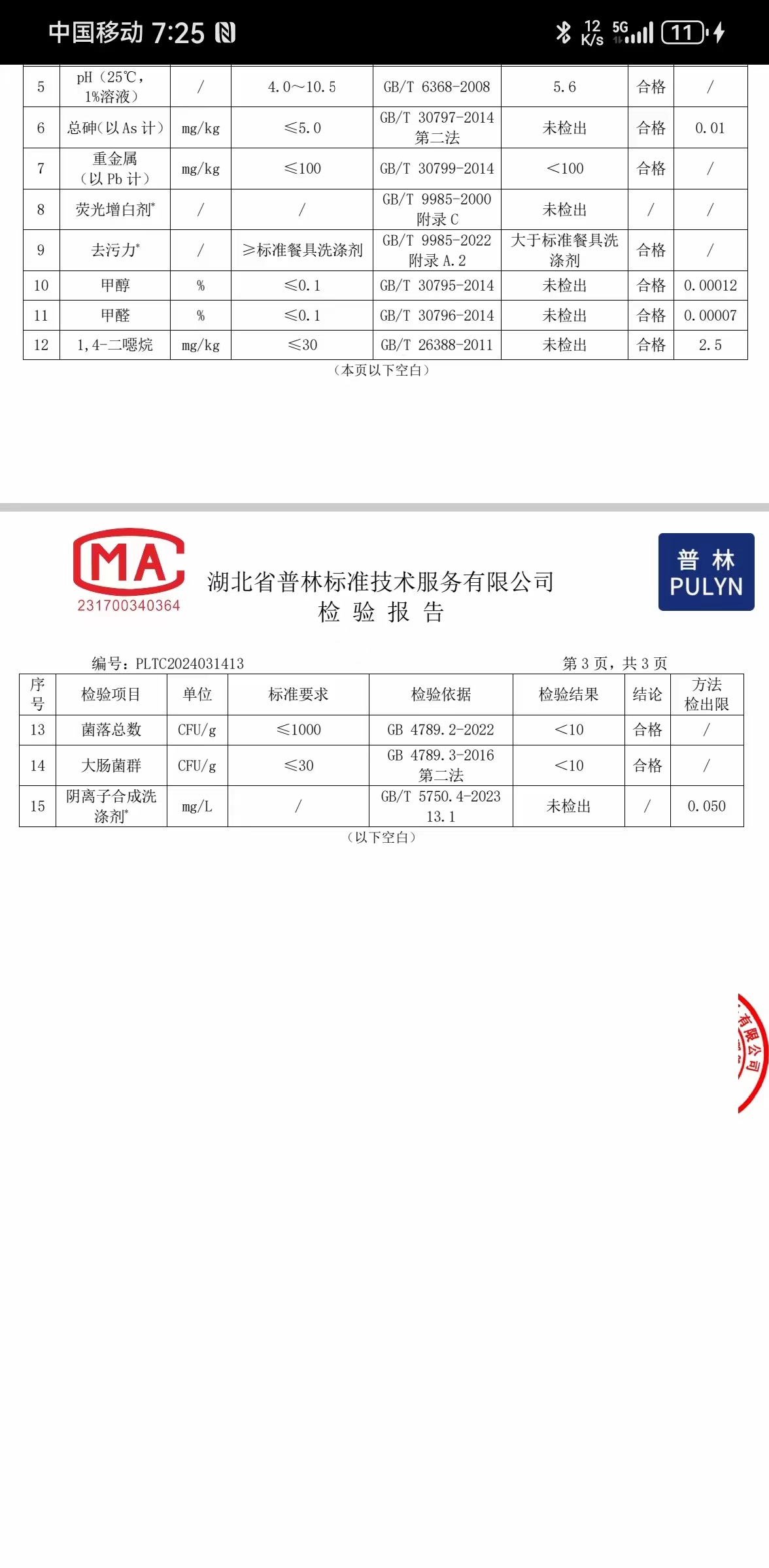 用戶無陰離子洗潔精質檢合格報告
