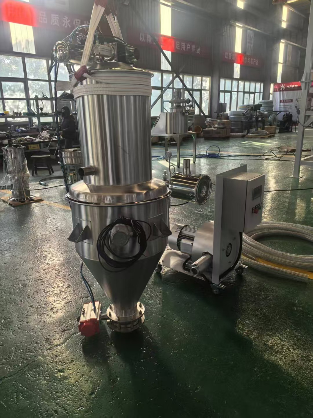 一種真空無塵粉狀原料加料機的使用,不僅有利于人身健康,更重要的是提高幾倍的加料速度,價格不貴,省時省力少危害,用過的老板都說好!